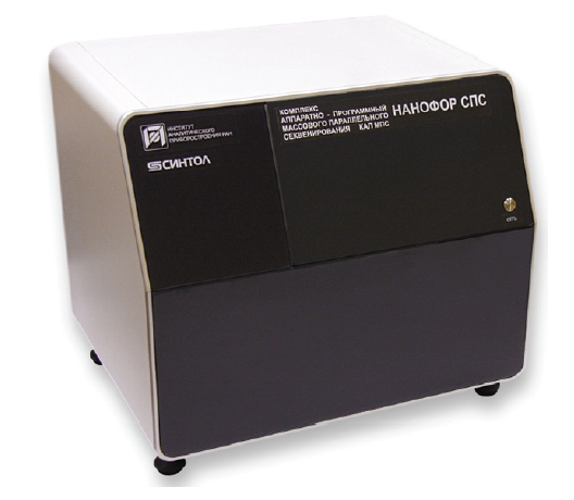Прибор для массового параллельного секвенирования ДНК НАНОФОР СПС (рис. 4) предназначен для секвенирования полных геномов вирусов, микроорганизмов, а также панелей генов. Он содержит одну проточную ячейку и обеспечивает возможность парноконцевого прочтения с максимальной длиной 250 нуклеотидов. За один цикл исследования прочитывается не менее 7,5 млрд нуклеотидов за время не более 40 ч.