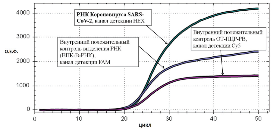Рис. 5. Положительный результат анализа на выявление РНК SARS-CoV-2, полученный на приборе АНК-32