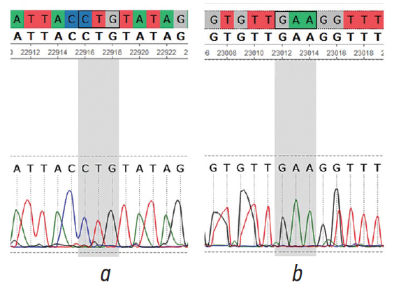Рис. 6. Фрагменты электрофореграммы, полученной на приборе НАНОФОР 05, соответствующие участкам гена, кодирующего S белок коронавируса SARS-CoV-2, замены CTG на CGG (S:L452R) (a) и GAA на CAA (S:E484Q) (b) в которых характерны для «индийского» штамма коронавируса