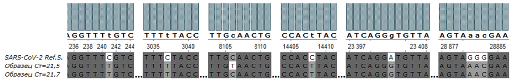 Рис. 7. Фрагменты двух расшифрованных геномов SARS-CoV-2, содержащие замены относительно референсного генома NCBI