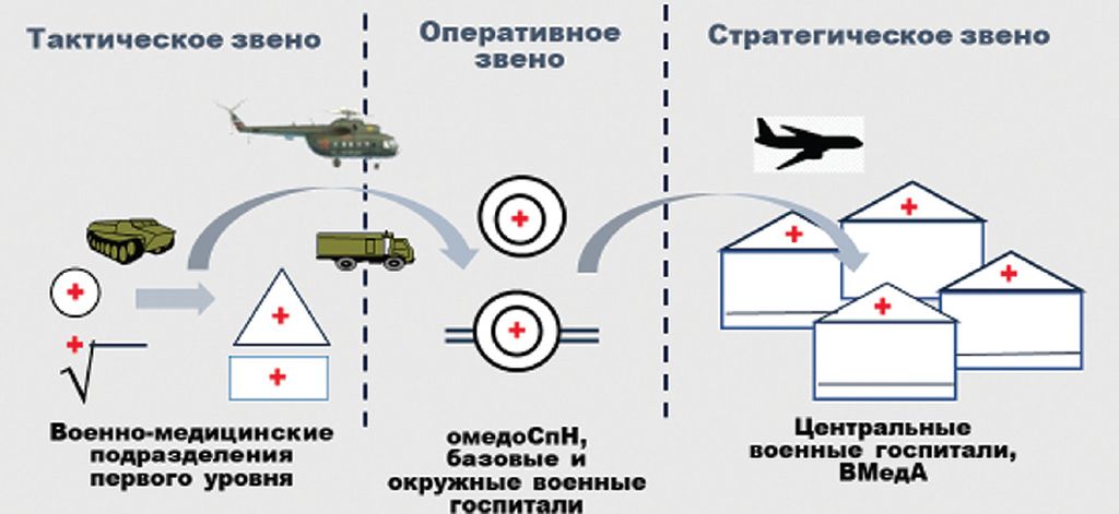 Рис. 1. Схема трехэтапной системы лечебно-эвакуационного обеспечения группировки войск (сил) в современном вооруженном конфликте