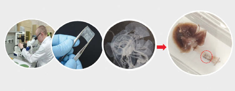 Рис. 5. Получение бесклеточного матрикса пуповины для создания тканеинженерного раневого покрытия (ВМедА МФТИ, ВИТ «ЭРА»)