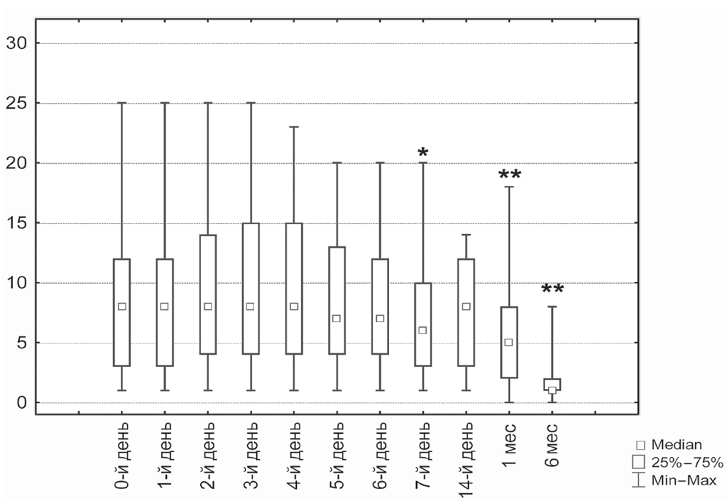 Рис. 1. Число пустул/фурункулов у больных, получавших стандартное лечение. Статистическая значимость отличий от показателей в 0-й день исследования (критерий Уилкоксона): * — p = 0,024, ** — p < 0,01