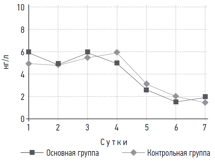 При проведении анализа полученных показателей отмечено, что снижение уровня прокальцитонина отмечается в обеих сравниваемых группах. Значимых различий в динамике не выявлено (рис. 6).