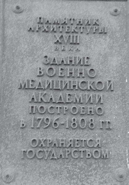Рис. 1. Мемориальная доска на здании управления Военно-медицинской академии по улице Академика Лебедева