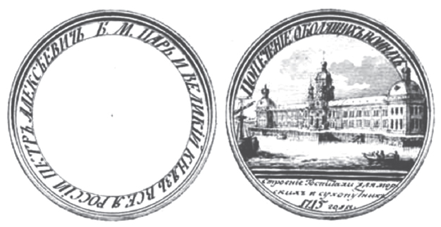 Рис. 2. Эскизы медалей, посвященных закладке Петром I генеральных Сухопутного и Адмиралтейского госпиталей. Цит. по [9]
