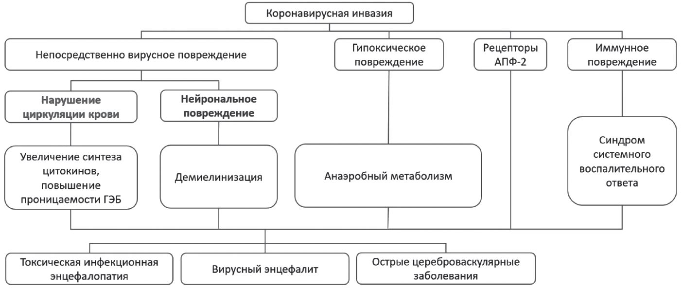 Анализ данных литературы позволил выделить следующие значимые механизмы воздействия высококонтагиозных коронавирусов (в том числе вируса SARS-CoV-2) на центральную нервную систему: нейродегенерация (в том числе цитокининдуцированная); церебральный тромбоз и церебральная тромбоэмболия; повреждение нейрососудистой единицы; иммуноопосредованное поражение нервной ткани, приводящее к развитию инфекционно-аллергического демиелинизирующего процесса.
