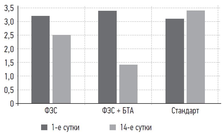 По шкале Эшфорта были выявлены статистически значимые различия в группе, в которой на 14-е сут от начала применения ФЭС использовался БТ типа А (рисунок).