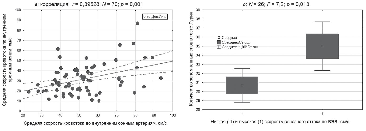 Венозный отток по ВЯВ синхронизирован с артериальным кровотоком по магистральным артериям головы. На рис. 1, a показана статистически значимая корреляция двух основных сосудистых систем артериального и венозного кровотока: ВСА и ВЯВ. На рис. 1, b показано, что лучший венозный отток связан с более успешным выполнением когнитивных функций, в частности с лучшей вербальной памятью, по сравнению с соответственно более низкой скоростью венозного оттока.