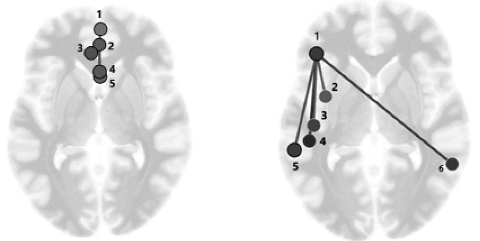 Рис. 2. Статистически значимо преобладающие коннективности в группе с нормальным венозным оттоком по сравнению с группой с низкой скоростью венозного оттока (a) и в группе с низким венозным оттоком по сравнению с группой с нормальным венозным кровообращением (b). Остальные объяснения в тексте; a (1 — Default Mode medial prefrontal cortex (Default Mode MPFC, 2 — Frontal Medial Cortex (MedFC), 3 — Paracingulate Gyrus (PaCiG), 4 — Salience Network anterior cingulate cortex (Salience ACC), 5 — Cingulate Gyrus anterior (AC)); b (1 — Fronto-Parietal NetWork, lateral prefrontal cortex (Fronto- Parietal LPFC, 2 — Insular Cortex (IC), 3 — Heschl’s Gyrus (HG), 4 — Parietal Operculum (PO), 5 — Salience NetWork, supramarginal gyrus (Salience SMG), 6 — Temporooccipital part Middle Temporal Gyrus (toMTG))