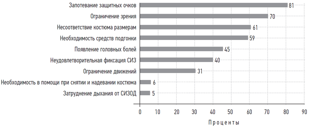 Согласно субъективным ощущениям большинство респондентов (61 %) отмечали, что в СИЗ им было жарко и, как следствие, мучало повышенное потоотделение.