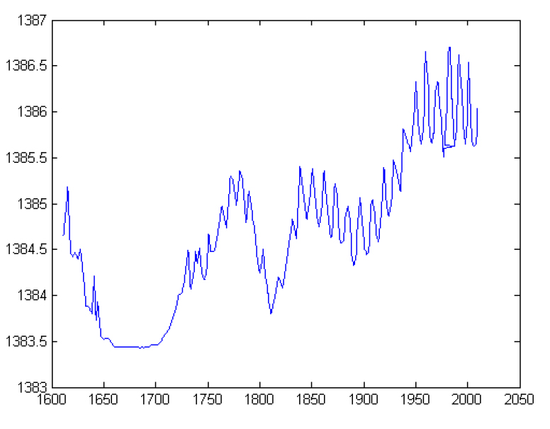 а) график изменений солнечной постоянной в Вт/м2 ( (по ординате) в интервале времени (1610–2010 гг.) (по абсциссе)