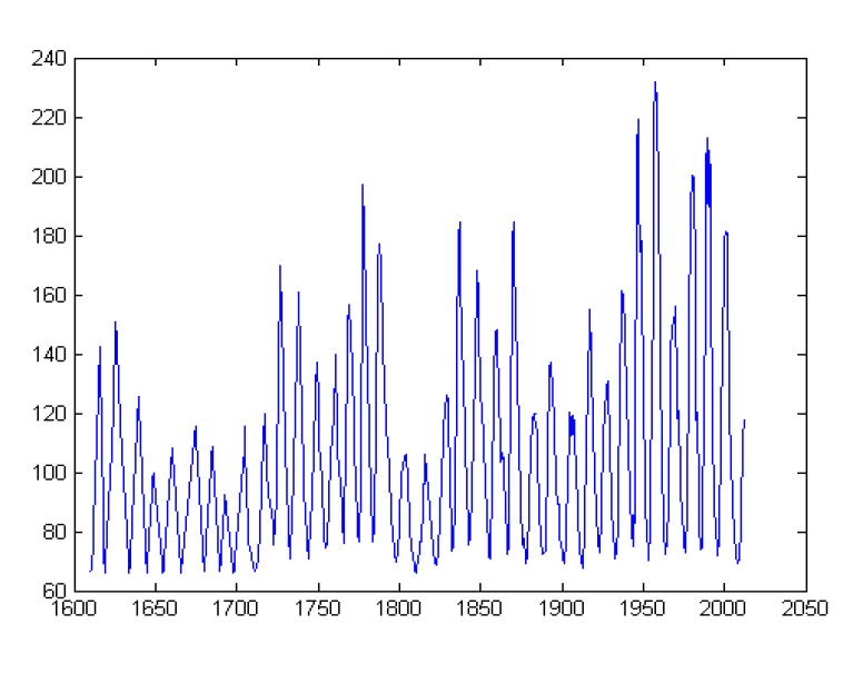 б) график изменений солнечной активности, числа солнечных пятен (по ординате), в интервале времени (1610–2010 гг.) (по абсциссе)