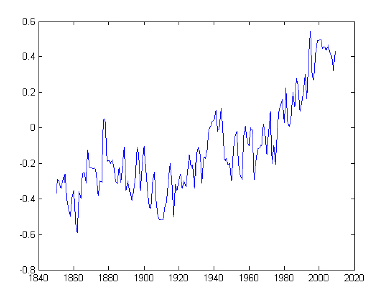 в) график изменений глобальной приземной температуры воздуха в градусах Цельсия относительно (1961–1990 гг.) – по ординате в 1850–2009 гг. – по абсциссе