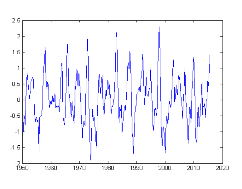 г) график изменения индекса Эль-Ниньо (средней температуры поверхности экваториальной части Тихого океана (SST) в (по ординате) в 1950–2015 годы