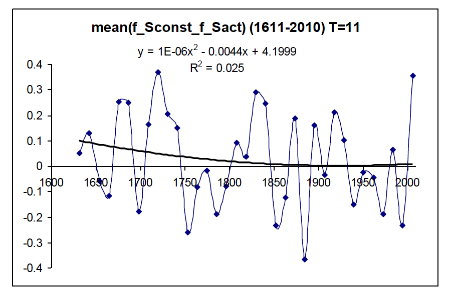 Рисунок 3 – Графики изменений «скользящих» средних и функции запаздывания по фазе солнечной активности относительно изменений солнечной постоянной в радианах (по ординате) в интервале времени (1610–2010 гг.) (по абсциссе) с окном усреднения 11 лет (111 отсчетов) и их квадратичные аппроксимации