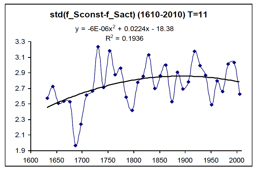 На рисунке 3 представлены графики изменений «скользящего» среднего () и «скользящего» стандартного отклонения () кривой запаздывания по фазе солнечной активности относительно изменений солнечной постоянной, т. е. функции в интервале времени в 1610–2010 годы с окном усреднения лет (111 отсчетов на временной оси). Мгновенные фазы изменений солнечной постоянной и солнечной активности вычисляются с использованием графиков а) и б) этих кривых, приведенных на рисунке 1, и одномерного непрерывного вейвлет-преобразования [Дьяконов, 2004]. Функция – циклическая, в которой опережение роста солнечной постоянной меняется опережением роста солнечной активности . В исследованном временном интервале (1610–2010 гг.) рост солнечной постоянной опережает рост солнечной активности в среднем с параметрами: радиан. Относительные изменения функций и хорошо виды на рисунках 2а и 2б скользящих средних и . Линейная аппроксимация циклически изменяющейся функции описывается формулой , которая отражает тенденцию опережения роста солнечной активности по сравнению с ростом солнечной постоянной со скоростью 0.0002 радиан в год в исследуемом интервале времени.