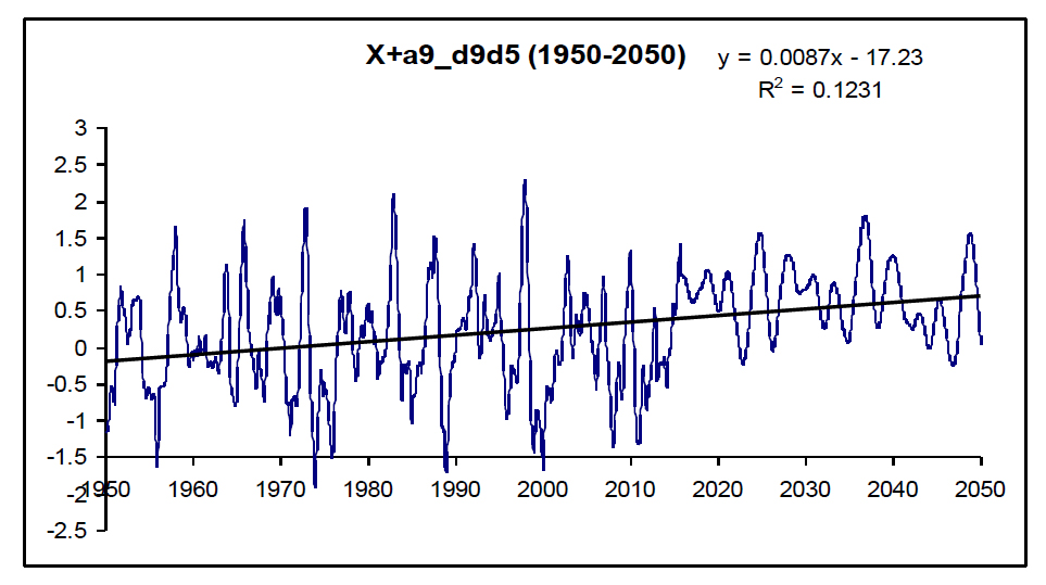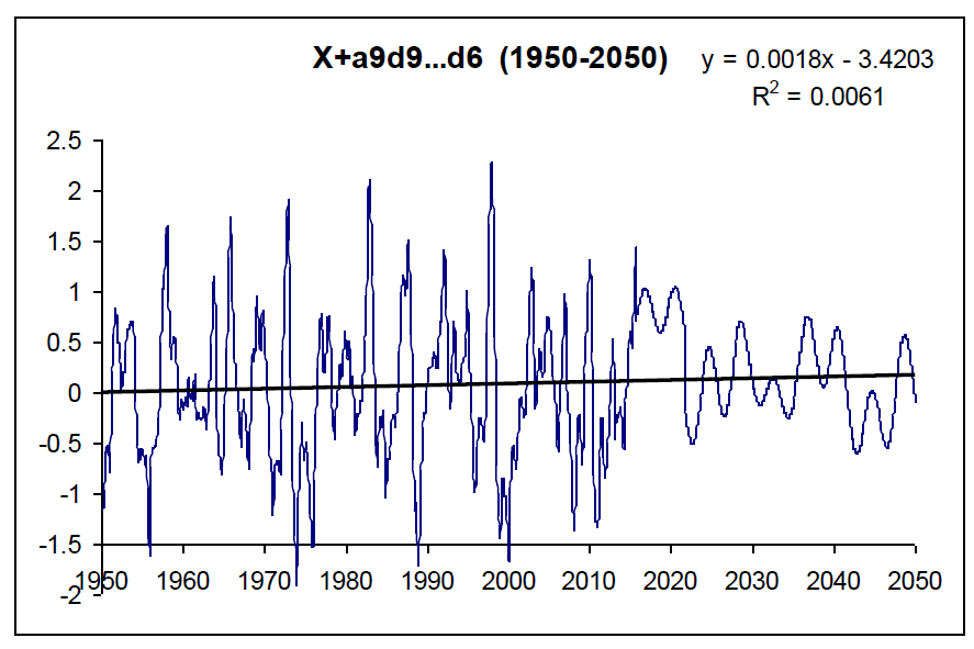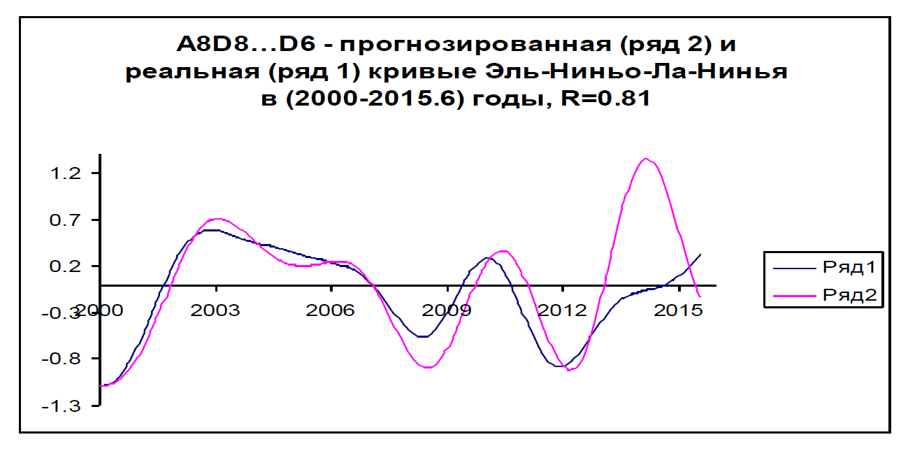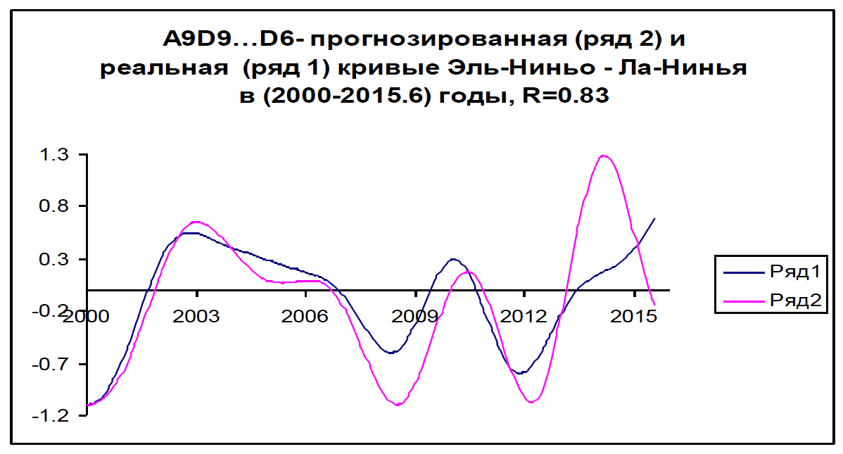 Из графиков рисунка 5, после 2016 года, наивысшего проявления Эль-Ниньо, ожидается небольшое ее отступление до 2019 года, затем усиление до 2021 года. В последующие годы намечается колебательный процесс с похолоданиями в окрестностях точек: 2010, 2023, 2026, … и потеплениями в окрестностях точек: 2021,2025, 2028, 2031, …