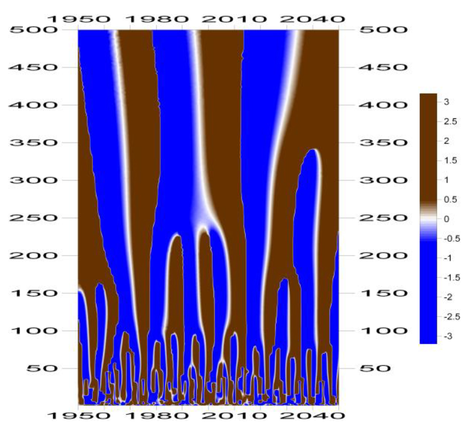 На приведенной вейвлетной ФЧХ четко наблюдаются периодичности интенсивностей и продолжительности проявлений Эль-Ниньо и Ла-Нинья в прошлом с 1950 года и в будущем до 2050 года на разных масштабных уровнях до . Видно, что как время ее проявления, так и ее продолжительность являются величинами случайными. Явления наблюдались и будут наблюдаться регулярно с периодом около 1.4–2.8 лет с нерегулярными интенсивностями. Из представленного изображения для масштабного уровня вейвлета выписаны интервалы интенсивных проявлений Эль-Ниньо в: 1950–1961, 1969–1977, 1984–1991, 1995–2002, 2008–2015, 2022–2030 годы, интервалы положительных значений фазы сигнала . Интервалы отрицательных значений фазы сигнала на рисунке 6 соответствуют интенсивным проявлениям Ла-Нинья.
