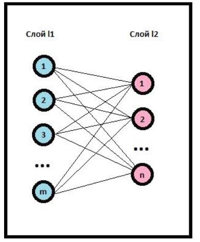 Рассмотрим функционирование перцептрона. Пусть первый слой нейронов состоит из m нейронов, а второй из n нейронов (см. рис. 1). Тогда вычисление значений нейронов второго слоя производится по следующим формулам [6]: