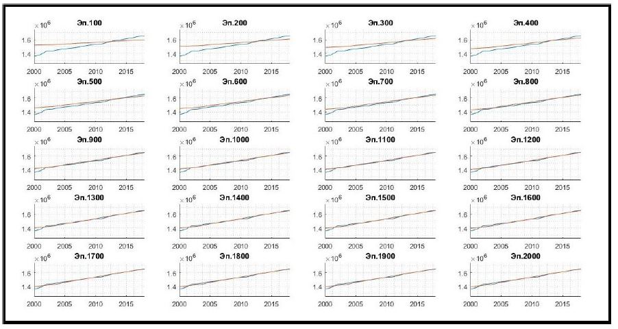 Как видно из рисунка 2, наблюдается постепенная сходимость реакции сети к динамике численности населения ХМАО, что свидетельствует об успешном процессе обучения сети.