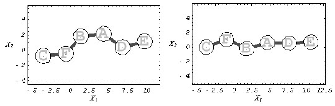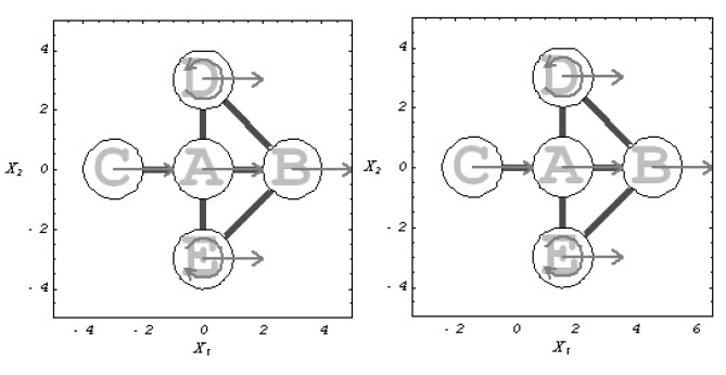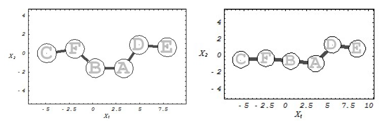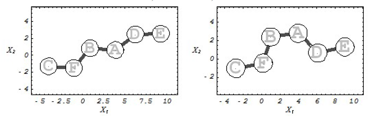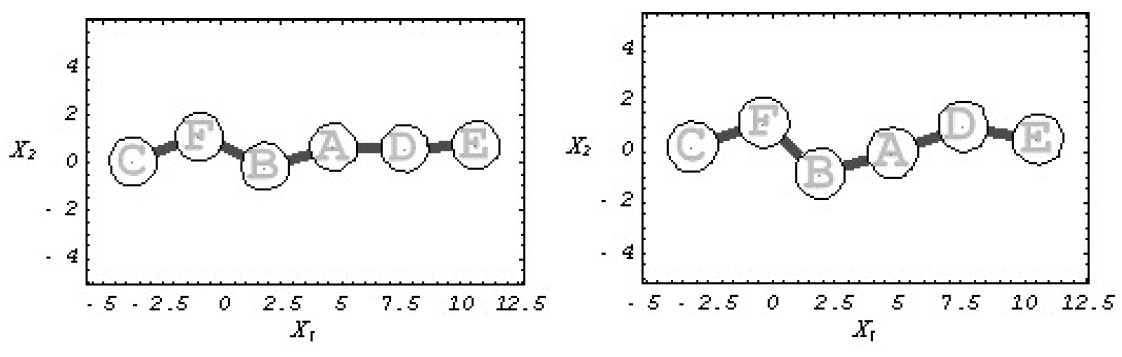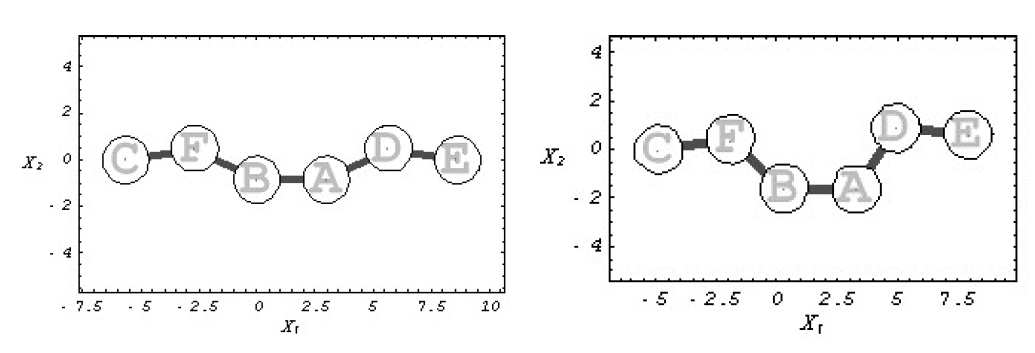 К частицам D и E,B и A, C и F, попарно приложены моменты MD и ME, MB и MA, MC и MF, соответственно, равные по величине и противоположные по знаку. В результате действия моментов частицы вращаются, создавая вихревое течение в окружающей жидкости. Течение жидкости создает силу, которая деформирует структуру. На рис. 4 приведены результаты численного моделирования при следующих значениях моментов: MD = – ME = -1,MB= – MA = -5,MC = – MF =2.