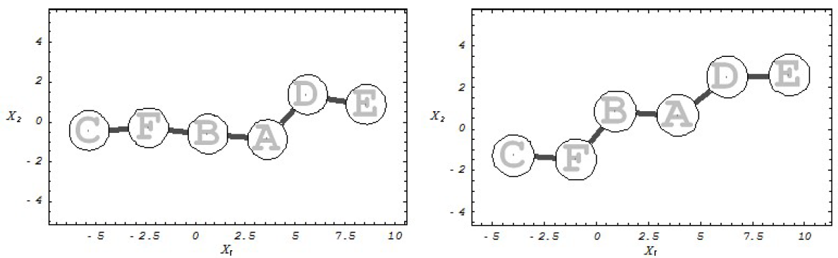 В последней конфигурации меняем значения внутренних моментов, действующих на частицы D и E. На рис. 6 приведены результаты численного моделирования при следующих значениях моментов: MD = – ME = -1,MB= – MA= 5,MC = – MF =5.