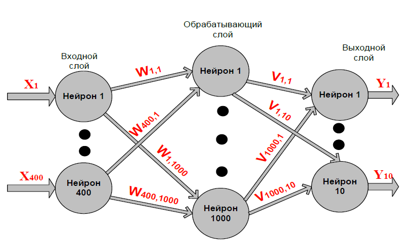 Входной слой представленного на рисунке 1 многослойного персептрона имеет 400 нейронов, то есть каждый нейрон отвечает за каждый пиксель изображения. Обрабатывающий слой содержит 1000 нейронов, это значение получено при использовании алгоритма описанного в [4]. Выходной слой содержит 10 нейронов, которые соответствуют цифрам от нуля до девяти. При обучении весовых коэффициентов будет использоваться модифицированный алгоритм обратного распространения ошибки, описанный в [5].