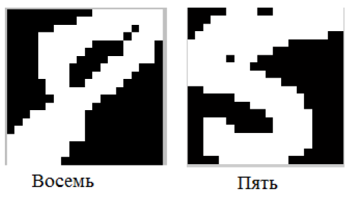 Используя архитектуру нейронной сети, соответствующей минимальной ошибке, определим количество верно идентифицированных образов: для обучающей выборки это 92 %, для тестовой 82 %. Эти результаты являются хорошими, если учитывать, что идентифицируются рукописные цифры, которые даже человеку затруднительно распознать. Пример таких цифр приведён на рисунке 3, которые взяты из тестовой выборки.