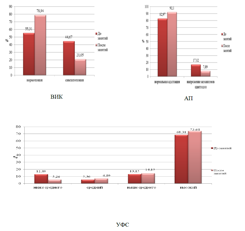 Материалы и методы исследования. В исследовании принимали участие 46 девушек в возрасте 17–18 лет, обучавшихся на первом курсе ФГБОУ ВО «Югорский государственный университет» г. Ханты-Мансийска. Определение психофизиологического статуса испытуемых было проведено в два этапа: в начале и при окончании обучения на первом курсе (соответственно, сентябрь 2015 г. и май 2016 г.). Оценка функционального состояния организма была осуществлена с использованием следующих коэффициентов: адаптационного потенциала (АП), уровня функционального состояния (УФС), вегетативного индекса Кердо (ВИК). С целью исследования уровня стресса студенток-первокурсниц использовалась методика определения качества жизни (Опросник Института медицины стресса (1993). Студентки, участвующие в исследовании, занимались аэробикой в рамках дисциплины «Элективные курсы по физической культуре» 2 раза в неделю.