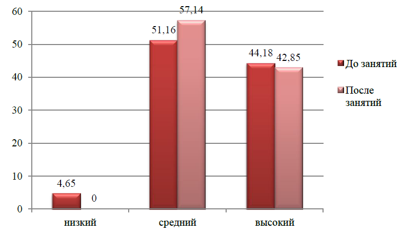 Уровень функционального состояния организма, определяющего особенности жизнедеятельности и работоспособности человека, достоверно увеличился с 0,66±0,14 (сентябрь 2015 г.) до 0,97±0,11 (р<0,05) (май 2016 г.). При этом относительное количество девушек с высоким, выше среднего и средним уровнем функционального состояния повысилось во втором этапе исследования на 5,37 %, 1 % и 1,26 %, соответственно.