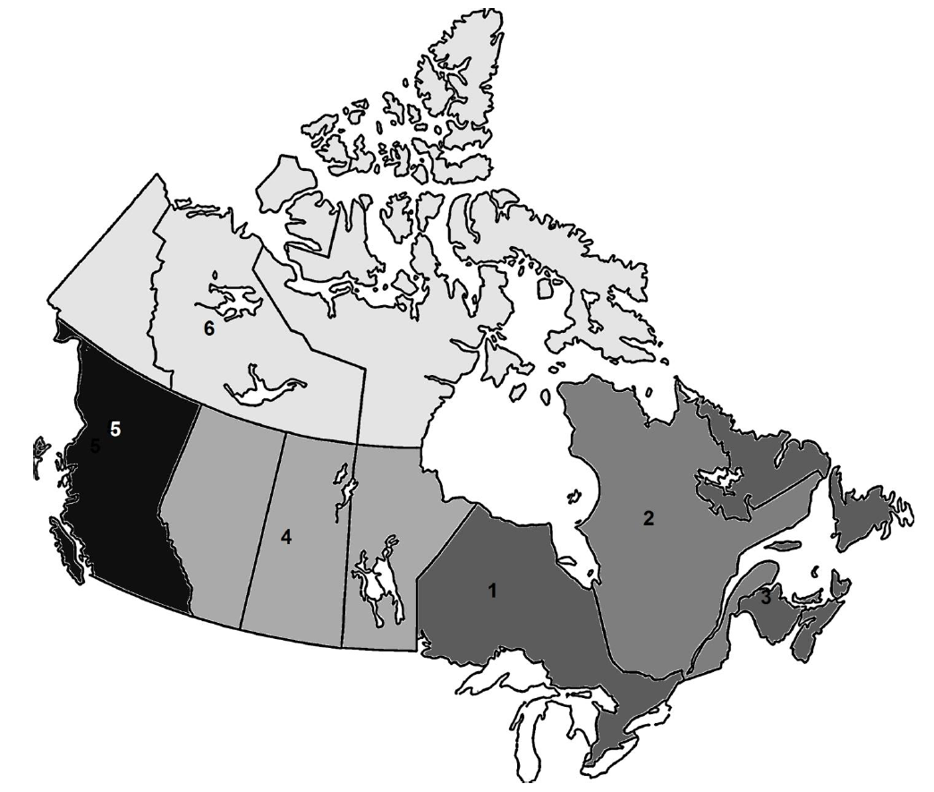 1 – Приозерье, 2 – Квебек, 3 – Восточное побережье, 4 – Центр, 5 – Западное побережье, 6 – Север.