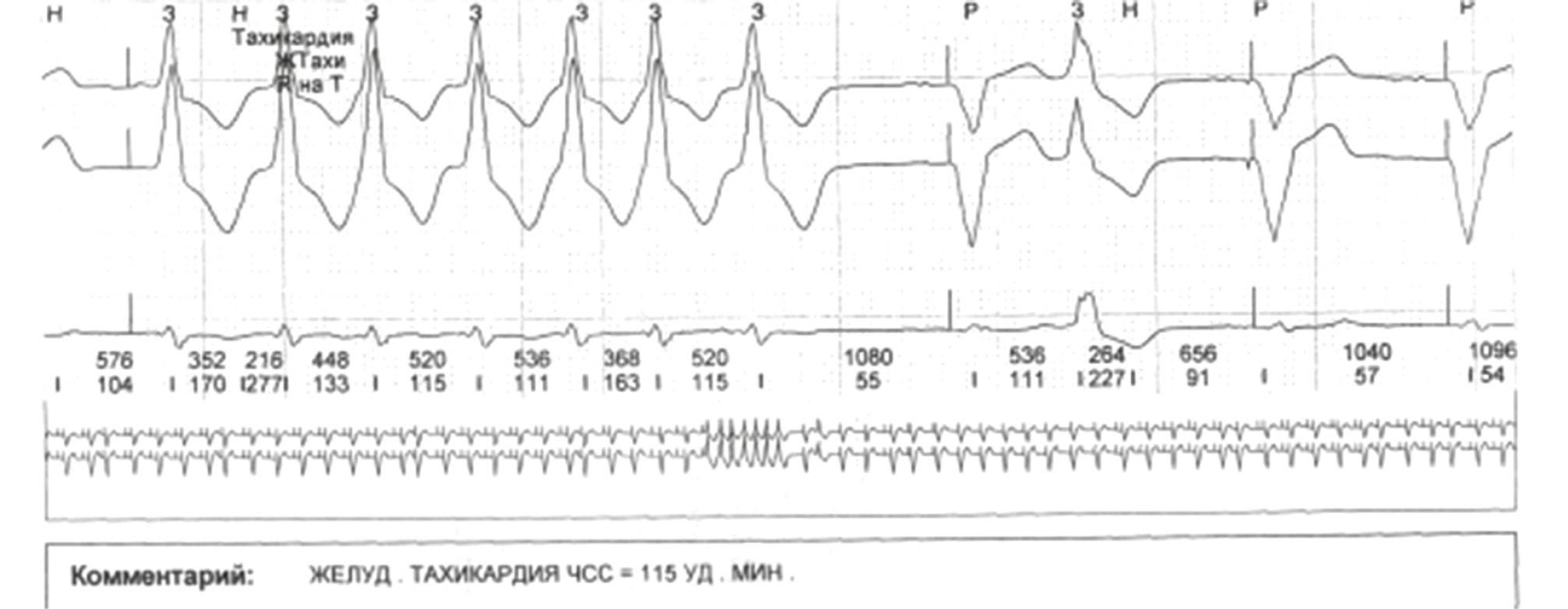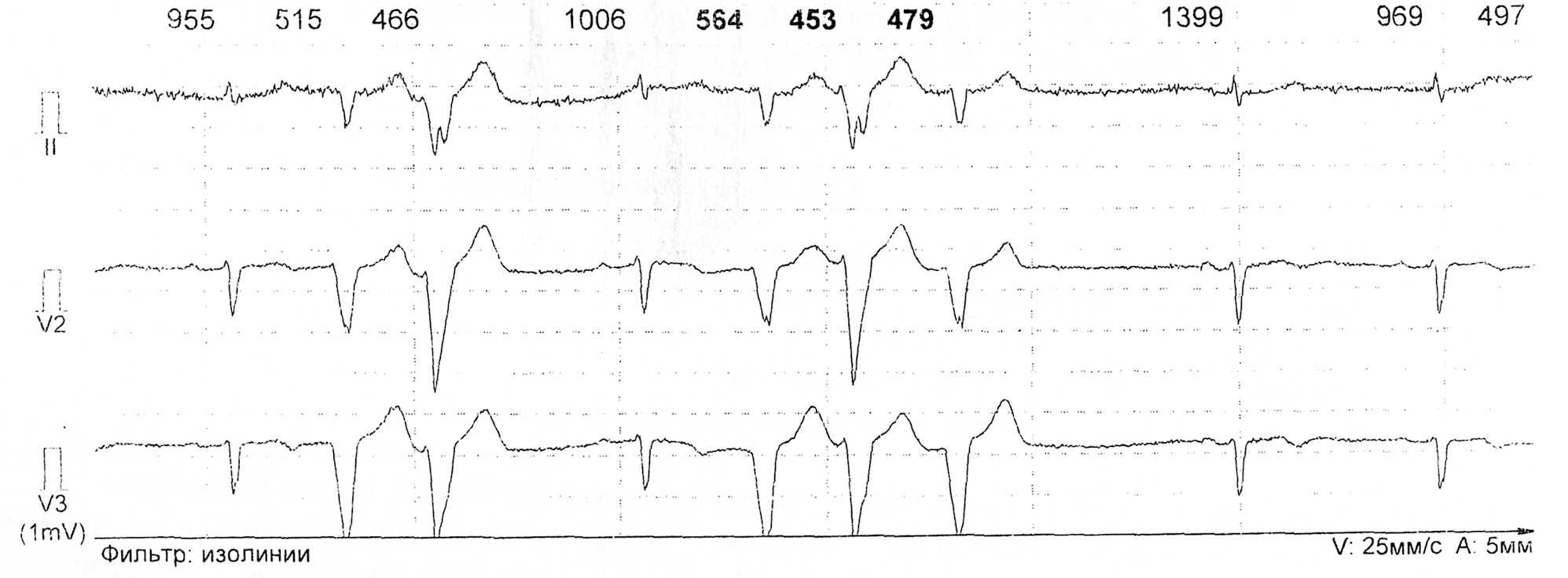 Coronary angiografy was performed to rule out coronary shuntes stenosis as the cause of ventricular arrhythmias: the shuntes were patent, and no hemodynamically significant stenoses were detected outside the bypass areas of the coronary arteries. An echocardiographic (ECHO) examination revealed cicatricial changes in the myocardium of the left ventricle (LV), with a lesion area of 31% and a local contractility index of 1.6, LV diastolic dysfunction, dilatation of the left atrium (LA), LV EF 58%. Due to the lack of indications for implantation of a cardioverter-defibrillator, a catheter procedure was performed for ventricular arrhythmias. A year later, in 2011, the patient developed paroxysmal AF against the background of binodal dysfunction that had developed by that time. Instead of acetylsalicylic acid, anticoagulant therapy was prescribed (warfarin under the control of INR with a transition to rivaroxaban 20 mg per day). Due to binodal dysfunction, complicated not only by AF, but also by syncope, in 2012 a permanent dual-chamber pacemaker (PM) was implanted. During 24-hour ECG monitoring after PM implantation it was observed an alternation of A-V sequential pacing with ventricular pacing after atrial tracking, a decrease in the number of ventricular extrasystoles to 100 per day (as compared to the year 2010), episodes of unstable ventricular tachycardia to two per day (Fig. 2). As expected, the catheter procedure for ventricular arrhythmias associated with postinfarction cardiosclerosis gave a "cosmetic effect", reducing, but not completely eliminating ventricular arrhythmias. Amiodarone was added to therapy.