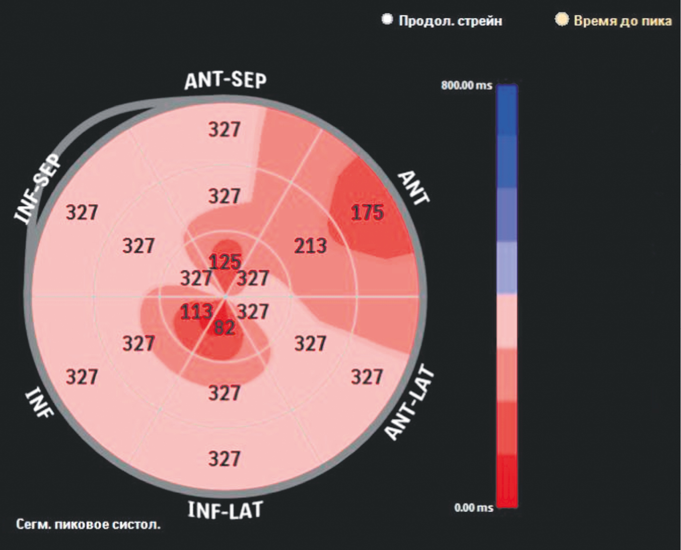 In September 2019, the patient was admitted to our clinic for examination and selection of therapy. Clinical examination showed: satisfactory condition, no peripheral edema, height 180 cm, weight 85 kg, body mass index 26.2 kg/m2, blood pressure 110/70 mmHg., heart rate and pulse 60 beats per 1 minute, rhythmical (PM rhythm). Borders of relative cardiac dullness: left — along the left mid-clavicular line, upper — 2nd intercostal space, right — along the right edge of the sternum. Auscultatory findings: 1st tone is muffled at the apex, the 3rd tone, a musical blowing systolic murmur at the apex. On percussion of the lungs there was pulmonary sound, on auscultation there was vesicular breathing, no wheezing. The liver is not enlarged. An ECHO study revealed a decrease in EF up to 25%, a global longitudinal strain of the left ventricular myocardium went down up to — 5.7%, an increase in EDVI up to 97 ml/m2 (significant deviation), and an LAVI up to 54 ml/m2 (sharp deviation) [5]. LV diastolic dysfunction of the 2nd degree was registered: the speed of movement of the lateral segment of the mitral annulus (Em) was 7 cm/sec (normal value ≥ 10 cm/sec), the speed of movement of the septal segment was 4 cm/sec (normal value ≥ 7 cm/sec), ratio E/Em reached off 13.6 (E is the peak velocity of the transmitral blood flow in the phase of rapid filling of the left ventricle, normal value ≤ 13), tricuspid regurgitation was absent [6]. The volume of mitral regurgitation was 34 ml, the area of the effective regurgitation orifice was 0.25 cm2, which corresponded to a severe degree of secondary mitral regurgitation [7]. The function of the RV was not impaired. Dyssynchrony of mechanical movement of the LV myocardium with a maximum delay in movement of the myocardium against the background of permament right ventricular stimulation outside the zone of scar tissue was found: in the area of the interventricular septum, mainly its inferior parts, the inferior wall, the posteriolateral and anterolateral walls at the basal and mid levels (Fig. 3).