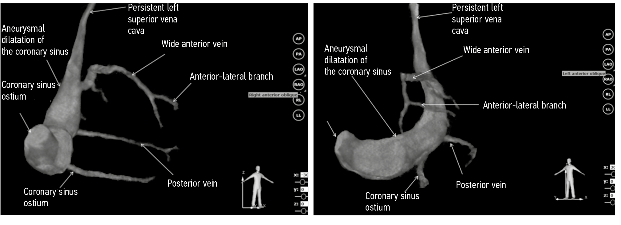 Cardiac resynchronization therapy (CRT) has been proven to be a method for treating patients with chronic heart failure (CHF) and complete left bundle branch block (CLBBB) in addition to optimal drug therapy [1]. Classically, the coronary sinus (CS) has branches, namely, the posterior interventricular vein (or middle cardiac vein) and the posterior vein [3] (or posterolateral vein [2]). Also, there may be one or several lateral veins. The great cardiac vein is a continuation of the CS at the level of the anterior part of the mitral valve. It bypasses the aortic root and is called the anterior vein (anterior interventricular vein) as soon as it passes to the anterior surface where it passes in the anterior interventricular sulcus. The anterolateral vein usually ends in the anterior vein at the level of the left ventricle (LV) basal segments [2]. In some sources, the great cardiac vein and the anterior vein throughout are called the great cardiac vein [3]. Endovascular implantation of left ventricular lead is considered classical; it is inserted into one of the CS veins, preferably into the lateral, posterior, or anterolateral vein [3]. This choice of a vein for implantation is based on the fact that, as a rule, the late activation zone in CLBBB is located in the basal region on the border of the LV lateral and posterior walls.