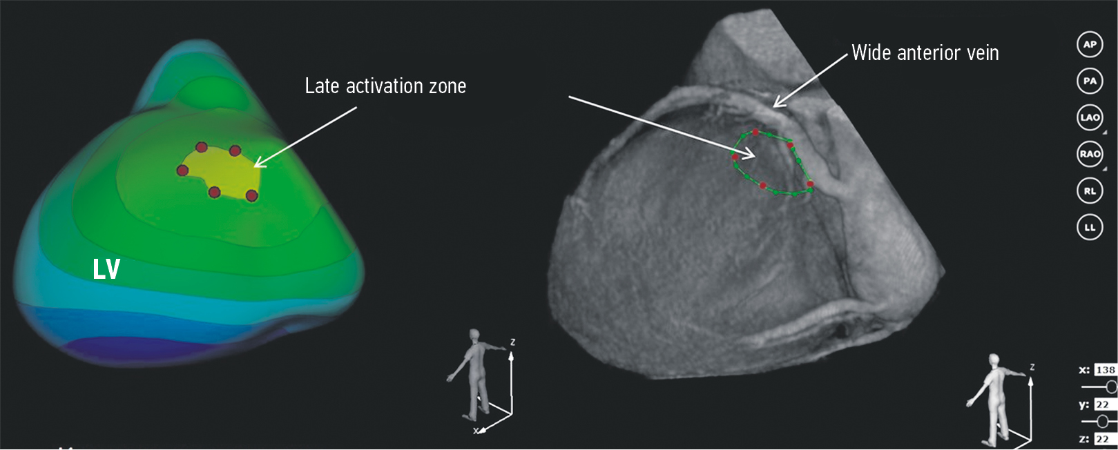 Fig. 2. Noninvasive mapping of the left ventricle. An isopotential map of the left ventricle is presented on the left. The late zone is indicated with red markers. Interpolation of the late zone on a three-dimensional anatomical model with coronary sinus veins are presented on the right. LV, left ventricle