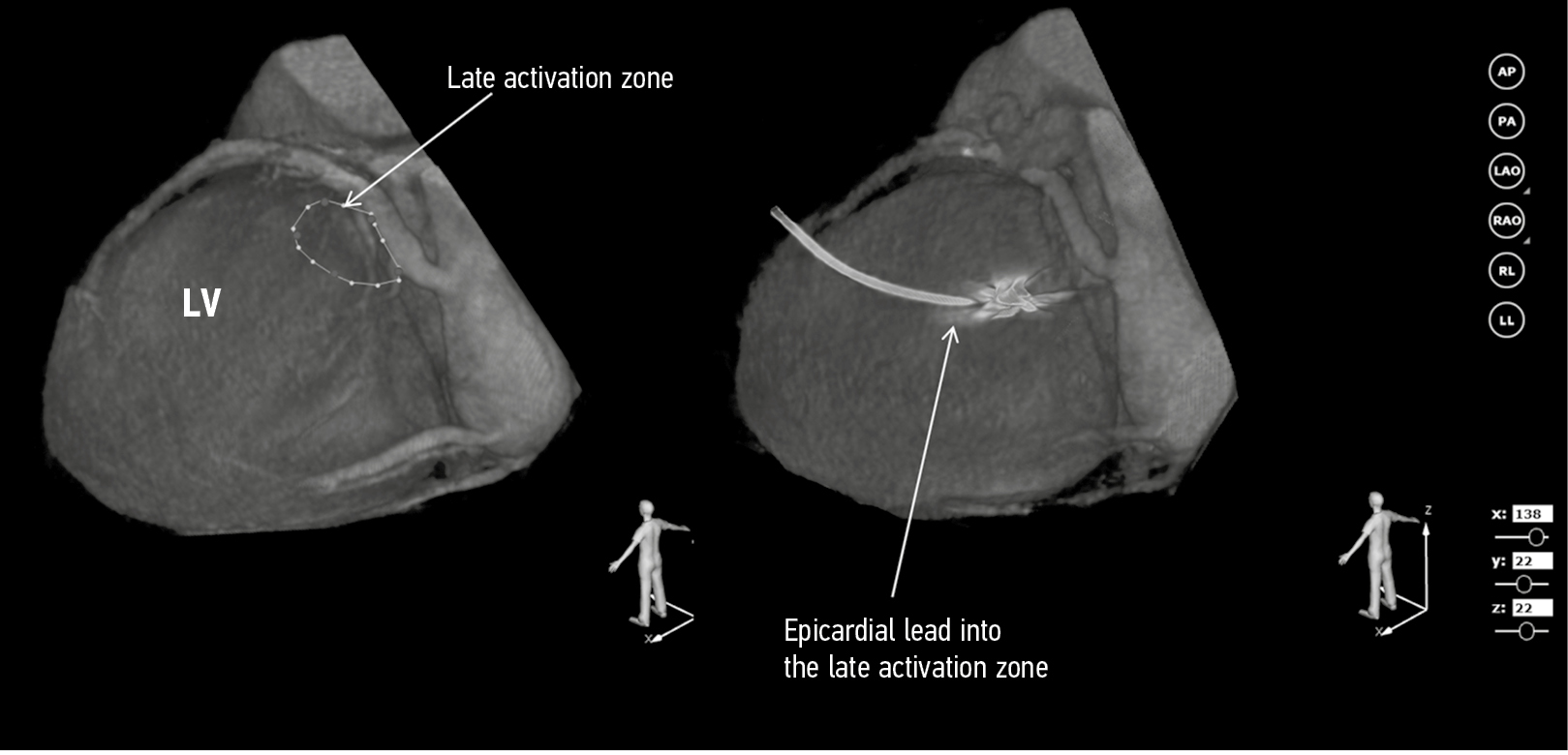 Fig. 3. Left ventricular lead was implanted epicardially in the region of the initial late activation zone of the intact myocardium. LV, left ventricle