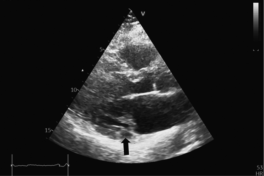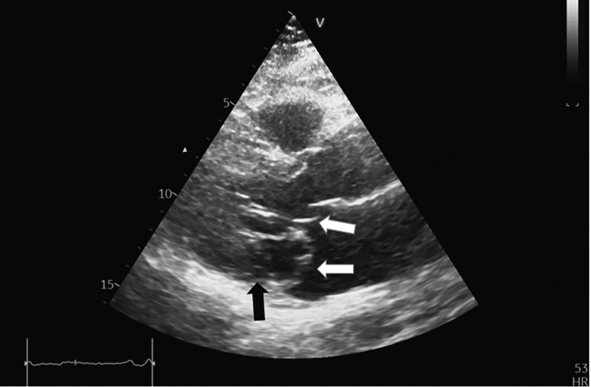 Fig. 2. Parasternal long-axis view of the left ventricle. Diastole. The elongated and thickened mitral valve leaflets (predominantly posterior) are visible. The black arrow indicates the disjunction area below the posterior mitral valve leaflet.