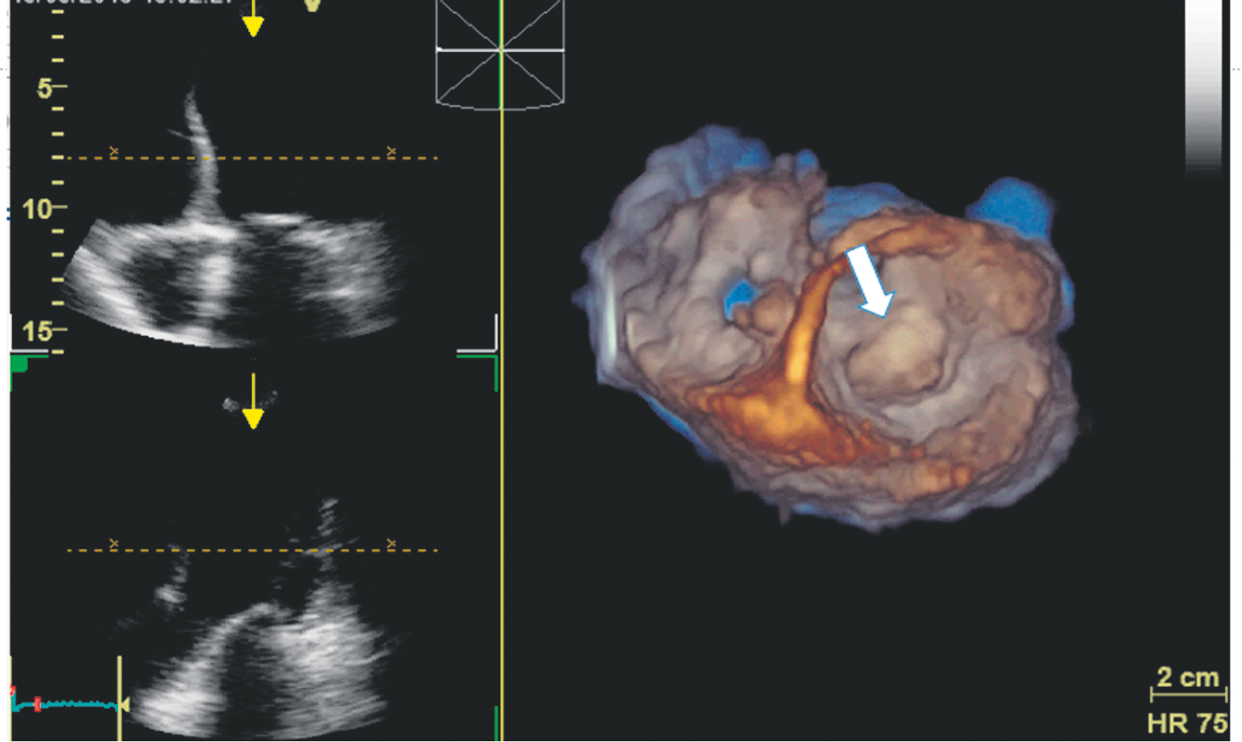 Fig. 3. Three-dimensional reconstruction of the mitral valve. The white arrow indicates the elongated and prolapsed mitral valve leaflets