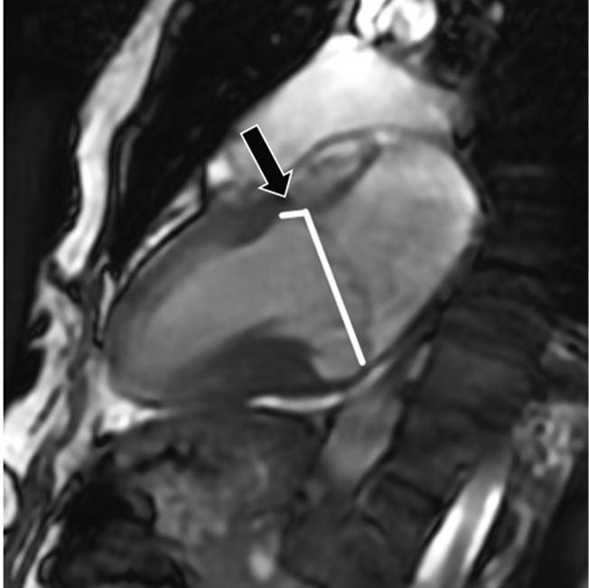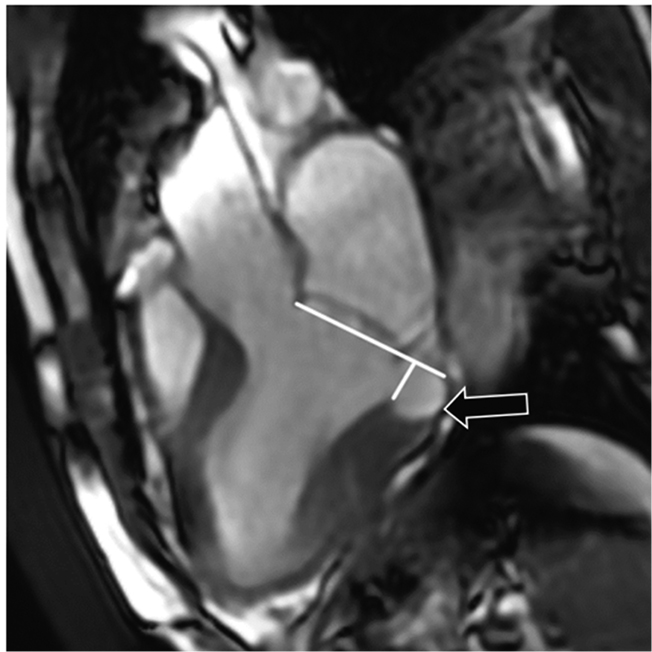 Fig. 6. Left ventricular long axis (two chamber view), cine end-systolic image. Measurement of the mitral annular disjunction distance for the anterior mitral valve leaflet. Mitral annular disjunction is indicated by an arrow