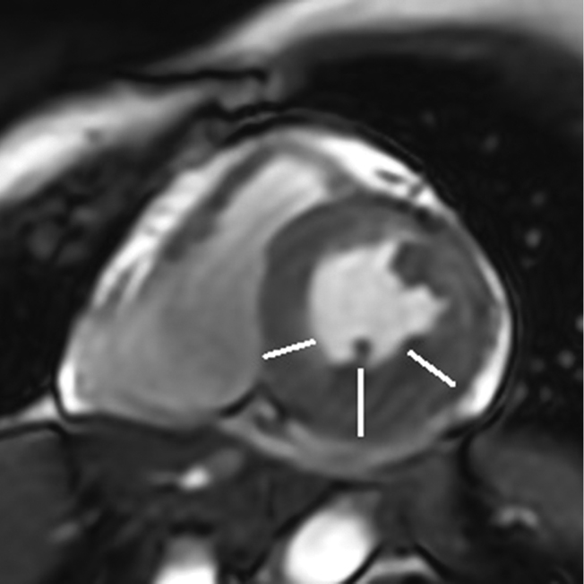 Cardiac magnetic resonance imaging (CMR) was performed on a Signa Pioneer 3.0 T scanner (General Electric Healthcare, Chicago, IL, USA) using 16-channel and 32-channel body coils to verify the diagnosis. Scans were performed according to a standard protocol with late contrast enhancement 8–15 min after injection of gadolinium-based contrast agent at a dose of 0.02 mmol/kg (0.5 mmol/L gadodiamide). The following pulse sequences were used: Fiesta Cine (dynamic cine imaging), T1 double-inversion recovery (DIR), T2 DIR fat saturation, and delayed myocardial enhancement (MDE) performed with breath-holding in standard cardiac projections. Postprocessing image analysis was performed using the CardiacVX software package (General Electric Healthcare). The following parameters were assessed: EF of 47% (normal range, 58%–76%), stroke volume of 84 (normal range, 59–115) mL, EDV of 180 (normal range, 90–171) mL, end-systolic volume (ESV) of 96 (normal range, 25–62) mL, EDV index of 105 (normal range, 59–93) mL/m2, ESV index of 56 (normal range, 16–34) mL/m2, myocardial mass of 160 (normal range, 71–143) g, and LA bi-plane volume of 112 (normal range, 47–131) mL.