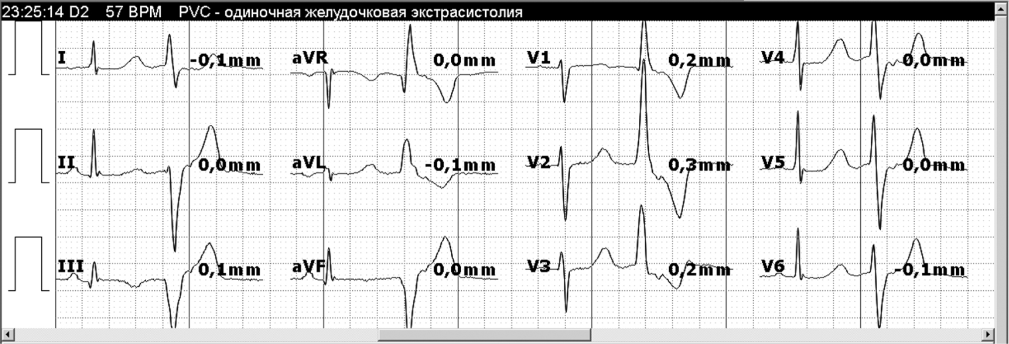 Thus, the diagnosis of MVP and MAD was confirmed by instrumental methods of examination. No indications for surgical intervention were revealed at this stage. Ventricular arrhythmias requiring medical correction were registered. At the previous treatment stage, beta-blocker monotherapy (2.5 mg/day bisoprolol) was ineffective. Therefore, combined antiarrhythmic therapy was decided. Slow-release metoprolol succinate was recommended at a starting dose of 25 mg once daily in the morning, followed by dose titration, if necessary, in combination with 25 mg allaforte in the evening. During therapy, repeated 24-h ECG monitoring revealed no runs of nonsustained ventricular tachycardia and registered a significant decrease of number of PVCs from 8,520 in 24 h to 5,000 in 24 h. The patient is still being followed up.