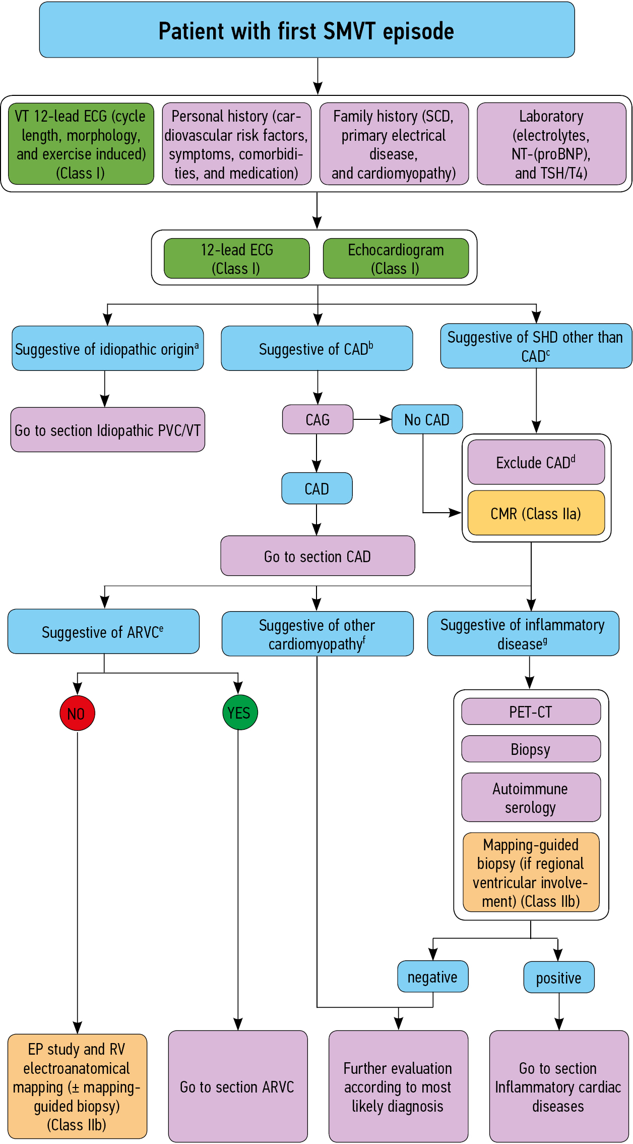 The review presents new indications to help with diagnosis and treatment of ventricular arrhythmia (VA) in patients with various etiologies of rhythm disturbances, including patients with coronary artery disease, cardiomyopathies, channelopathies, inflammatory heart disease, neuromuscular disease, and congenital heart defects. Algorithms for diagnostic evaluation at first presentation with VAs in patients without known cardiac disease are given.
