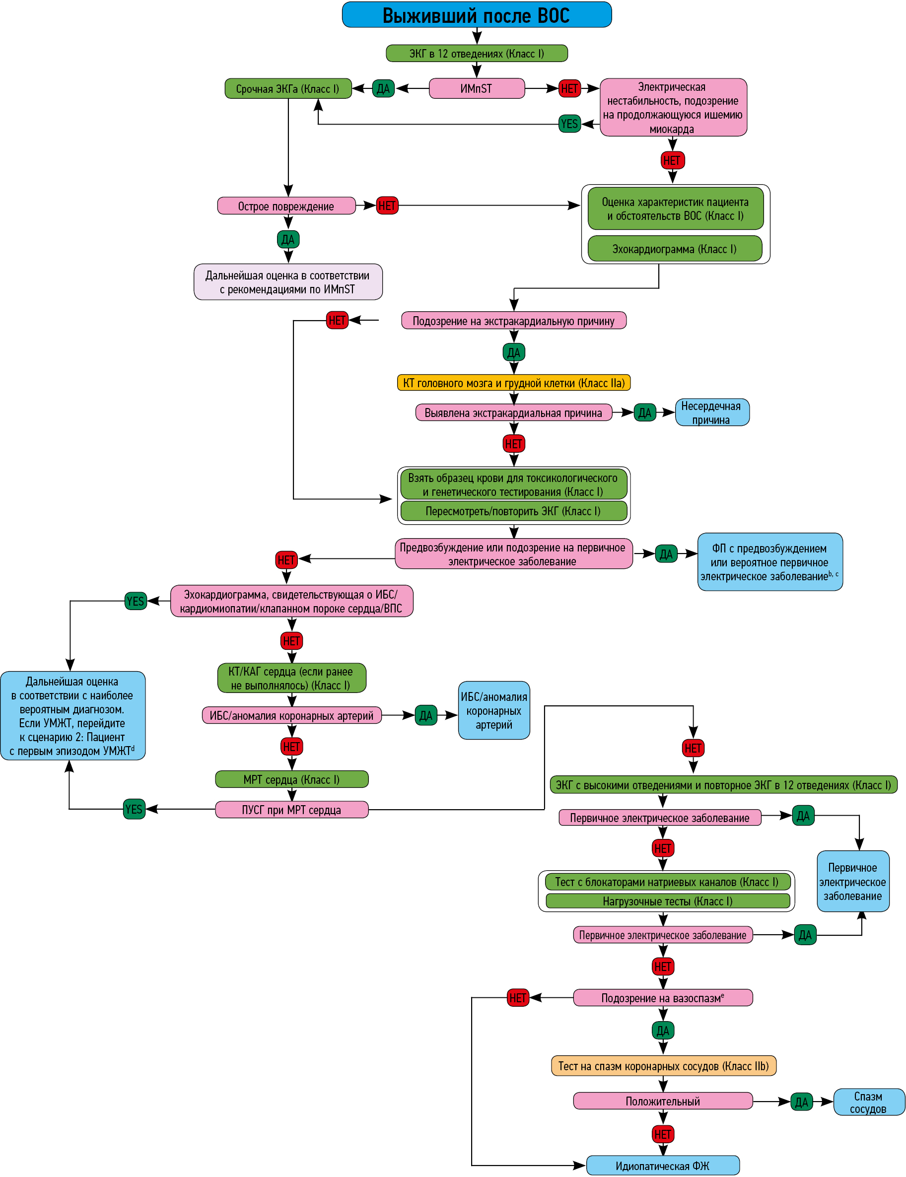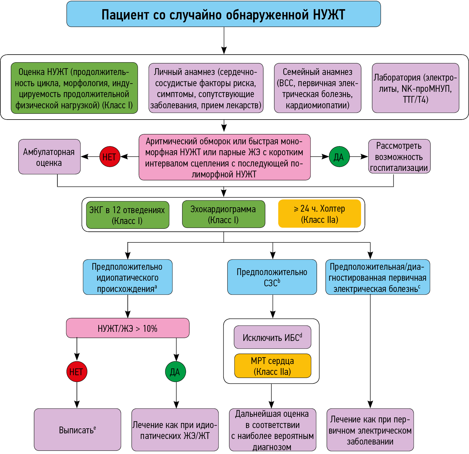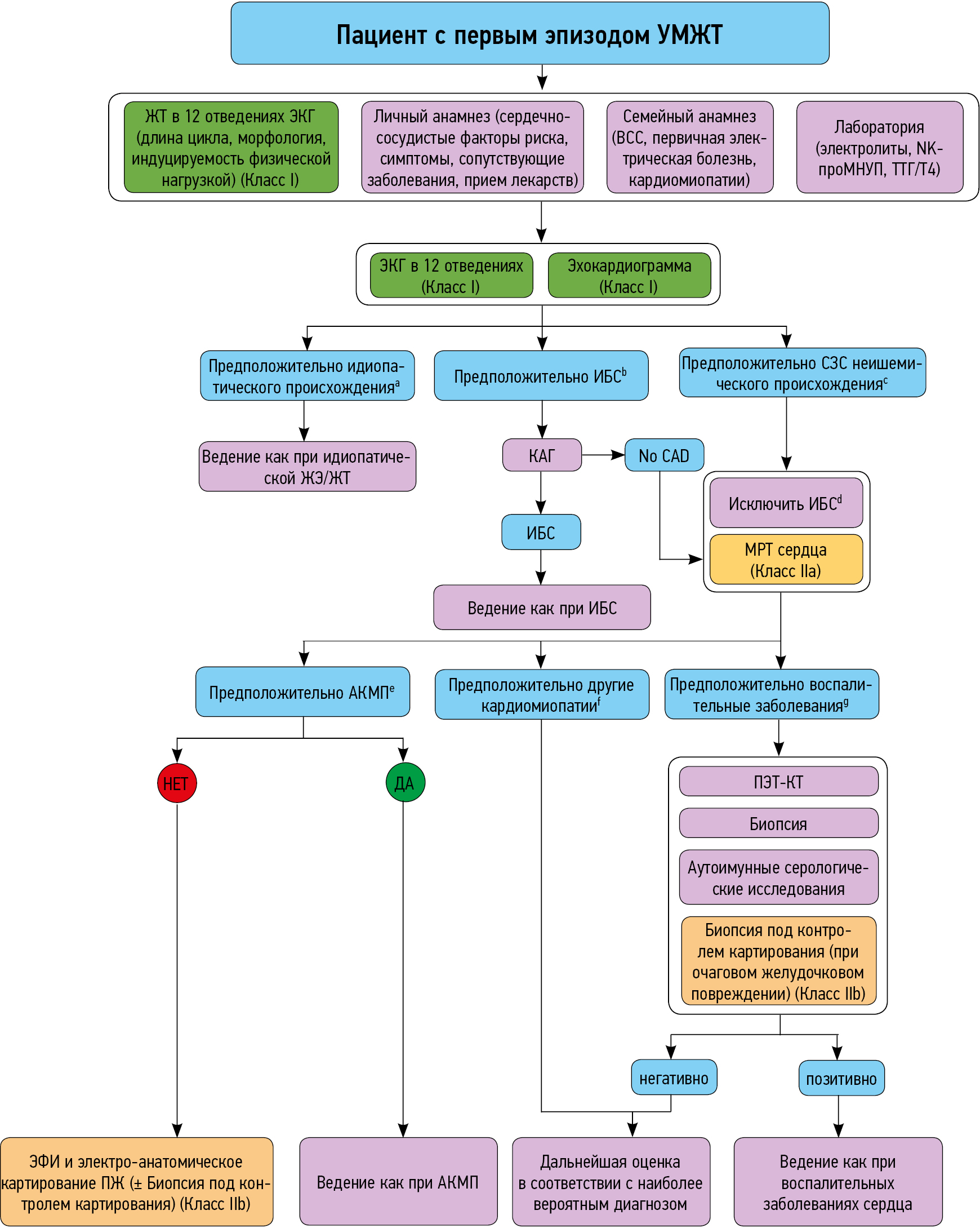 В обзоре представлена информация о новых показаниях, которыми следует руководствоваться при диагностике и лечении желудочковых нарушений ритма у пациентов с разной этиологией нарушений ритма, в том числе у пациентов, страдающих ишемической болезнью сердца, кардиомиопатиями, каналопатиями, воспалительными заболеваниями сердца, нейромышечными заболеваниями, врожденными пороками сердца, даны алгоритмы диагностической оценки при первом обращении пациента с желудочковыми нарушениями ритма без известных сердечных заболеваний.