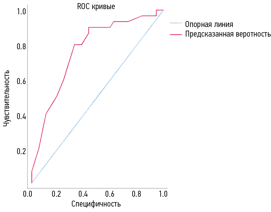 The resulting regression model was statistically significant (p = 0.001). Based on the value of Nigelkirk’s determination coefficient, the model (1) takes into account 28.4% of the factors that determine the probability of a positive hemodynamic response to CRT.