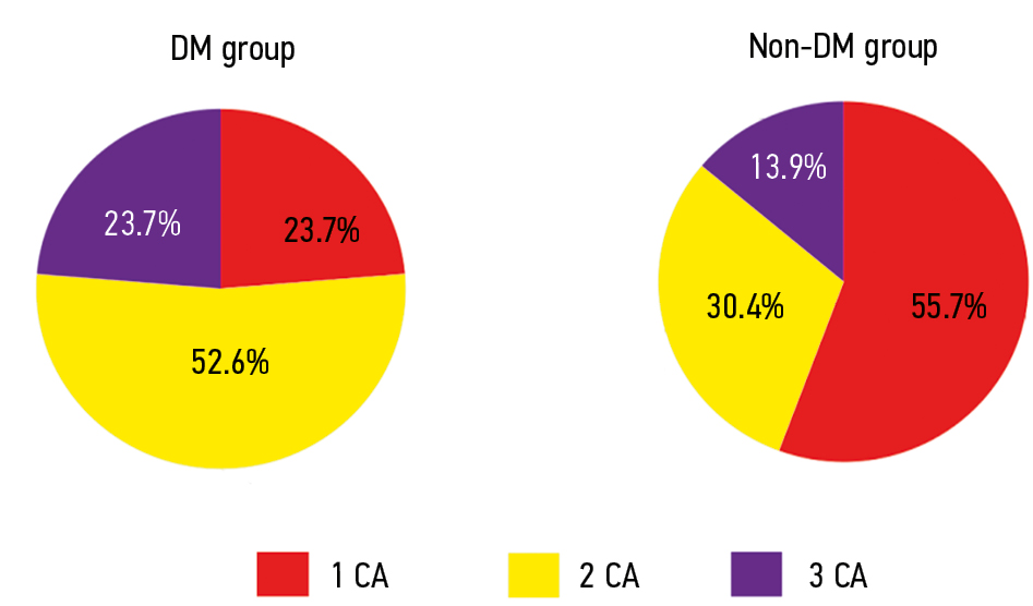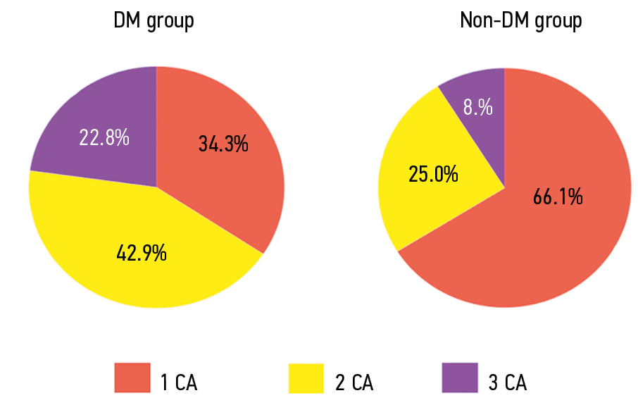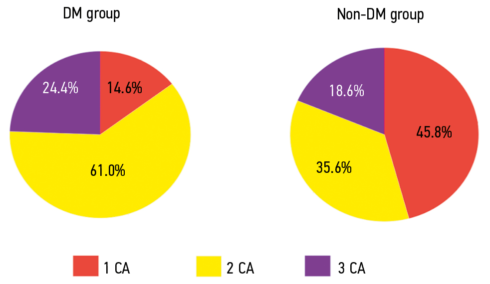 According to the coronary angiography (CAG) results, the incidence rates of lesions of CAs 2 and 3 were 52.6% and 23.7% (73.6%) in the DM group and 30.4% and 13.9% (44.3%), respectively, in the non-DM group.