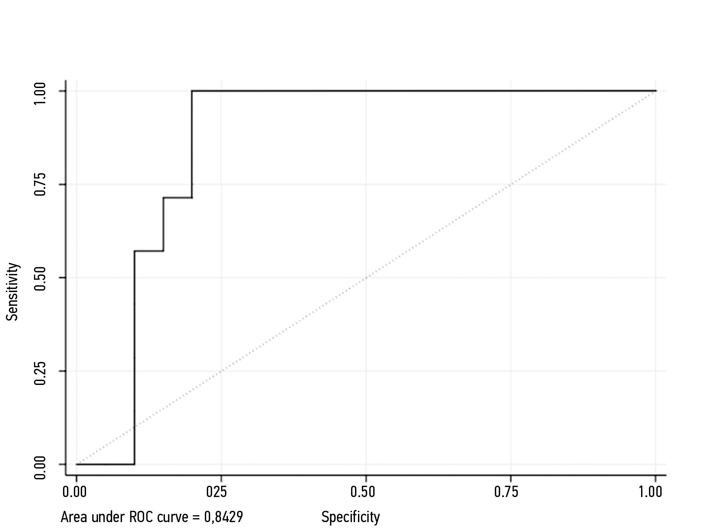 In the plotted graph, the AUC value was 0.8429, which indicates that the model is effective and has high predictive power. Serum NT-proBNP levels higher than 898 pg/mL on day 1 of MI after PCI in the DM group were a predictor of high-grade VES after 12 months with a sensitivity of 100% and a specificity of 80%.