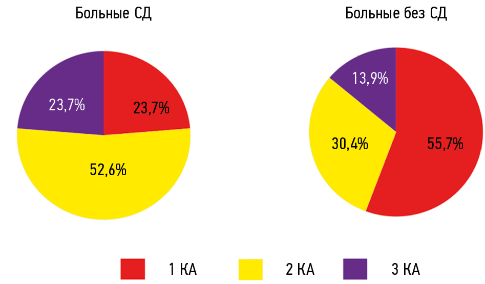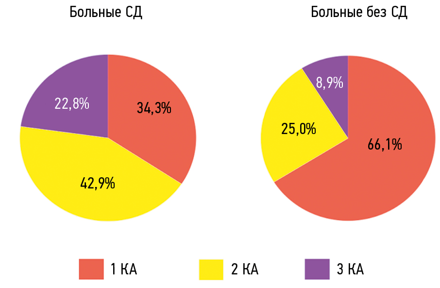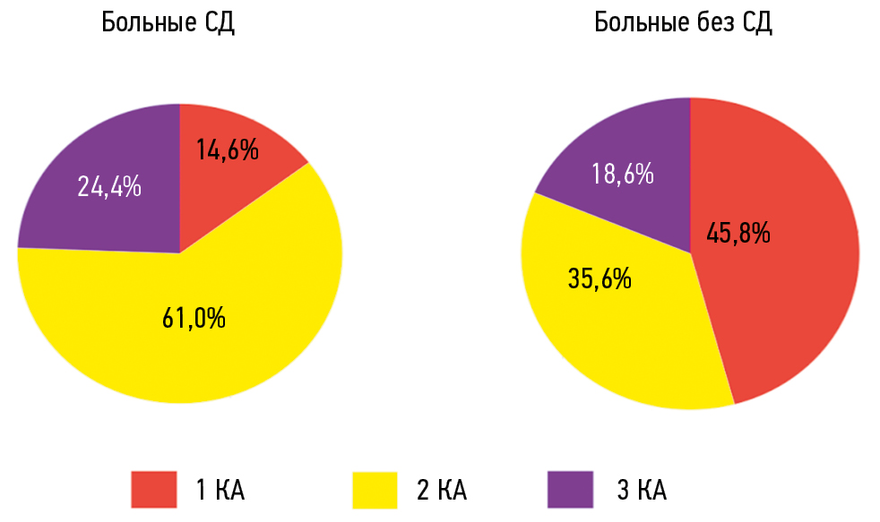Вероятно, эта зафиксированная разница обусловлена, с одной стороны, большим количеством желудочковых аритмий в постинфарктном периоде у пациентов с СД, с другой стороны, с более глубокой и длительной ишемией миокарда, связанной с особенностями поражения КА при диабете (рис. 1).