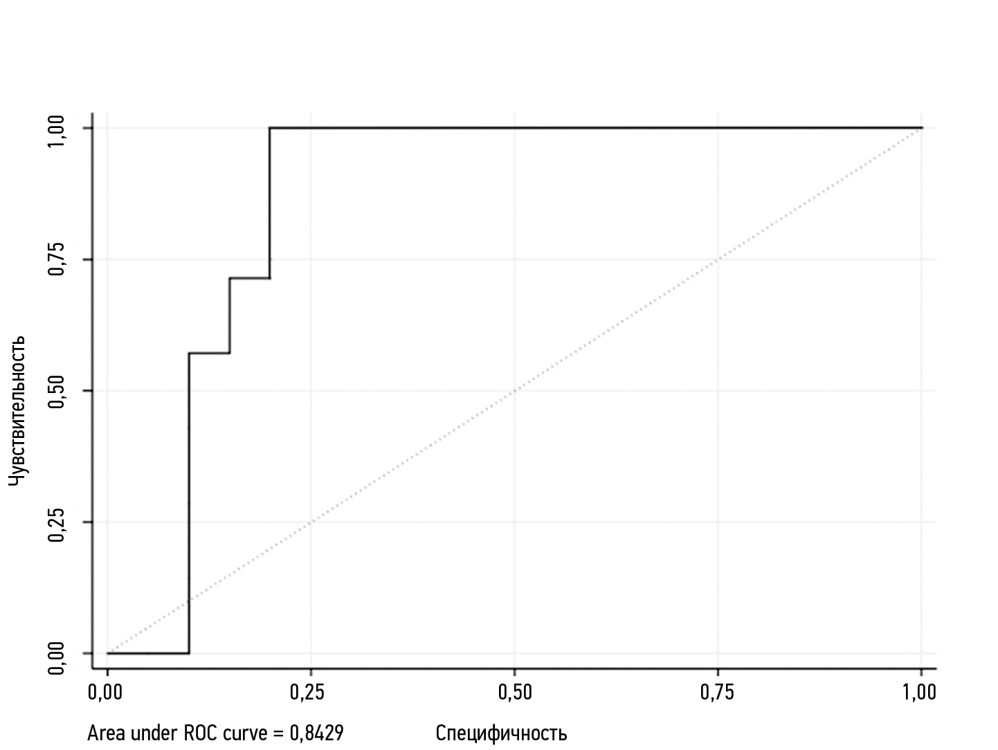 В построенном графике значение AUC составило 0,8429, что свидетельствует о том, что модель эффективна и в данном конкретном случае обладает высокой прогностической силой. Содержание в сыворотке крови NT-proBNP > 898 пг/мл в 1-е сутки ИМ после ЧКВ у больных СД является предиктором ЖЭС высоких градаций через 12 месяцев с чувствительностью 100 % при специфичности 80 %.
