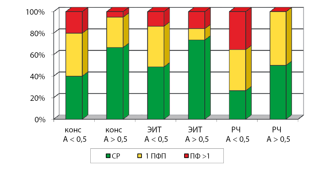 The studied groups initially did not differ in age and comorbidities (Table 1). However, the number of women whose rhythm was restored with the help of ET turned out to be almost 2 times less than in the groups of conservative therapy and RPVI (Table 1).
